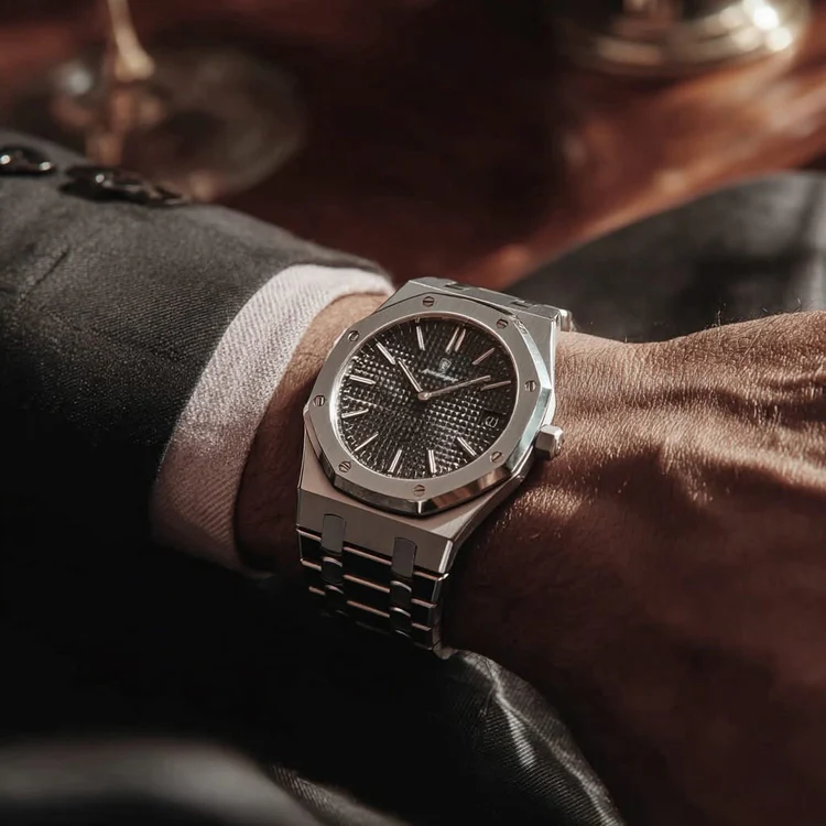 Den texturerade urtavlan ger ett exklusivt uttryck och fångar ljuset på ett sätt som billiga klockor aldrig kan.